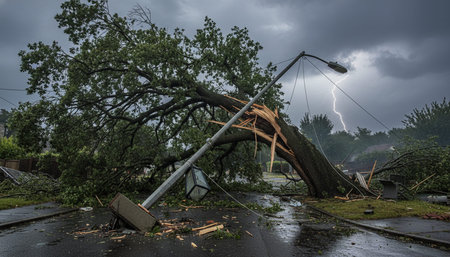 Damaged power lines after hurricane wind broke tree limbs in Florida suburban area. Electricity outage as consequences of natural disaster