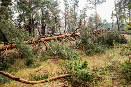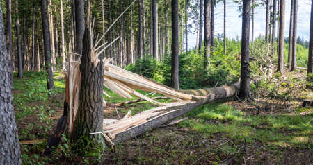 Broken tree trunks in the forest after storm. Fallen trees in the woods after hurricane