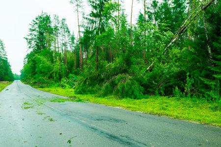 Road closed with safety ribbon, uprooted trees blocked forest road,after sleet storm