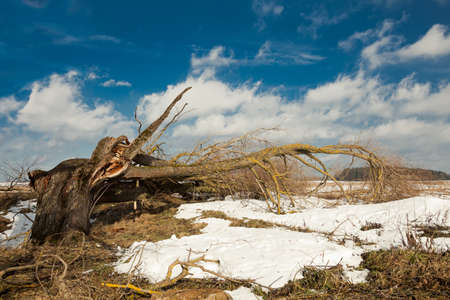 A fallen tree after a hurricane against the blue sky. A broken tree fell to the ground in a field or park from a strong wind.