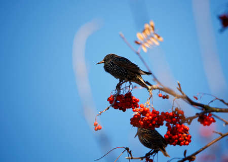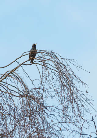 Beautiful bird the Common starling sitting on tree branch on blue sky background