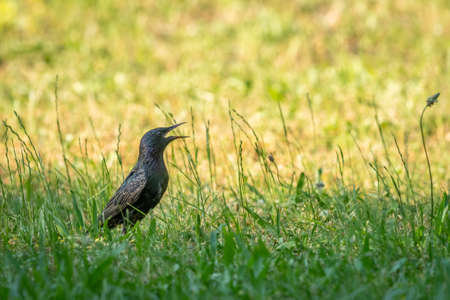 Common starling (Sturnus vulgaris) on a green meadow, sunny day in summer, Vienna (Austria)