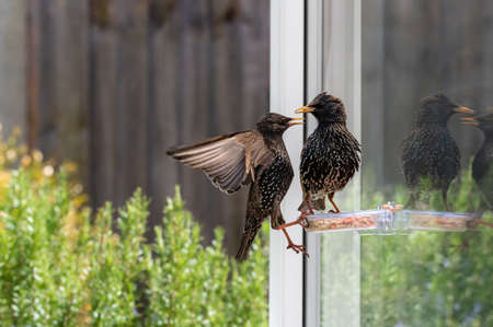 Starling, sturnus vulgaris, perched on window suet bird feeder with reflection