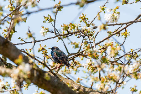 Common starling - Sturnus vulgaris - a medium-sized bird with dark and colorful plumage, sitting on a tree branch between blooming white cherry blossoms, sunny summer day.