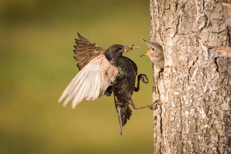 The Common Starling, Sturnus vulgaris is flying with some insect to feed its chick, the young bird is opening its beak to be feeded, pretty golden light, green background