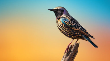 the european starling, with its iridescent feathers glistening in the sunlight, perches confidently on a sturdy brown stem, set against a vibrant and bright background, showcasing its striking plumage and distinctive white spots, a true marvel of nature and avian beauty. ai generated