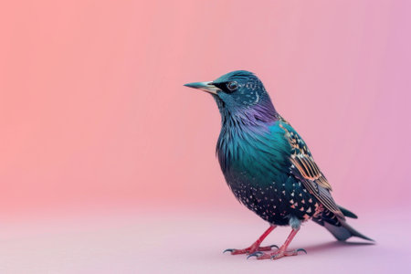 AI-Generated image of a striking European Starling captured in vivid detail. The bird’s glossy plumage shimmers with iridescent greens, blues, and purples, accented by golden-brown feather edges and white speckling.