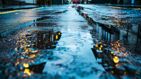 Moody urban nightscape Rainslicked empty streets with reflection-flecked wet asphalt and atmospheric fog against the backdrop of blurred city lights
