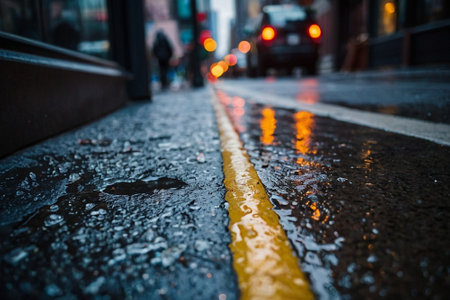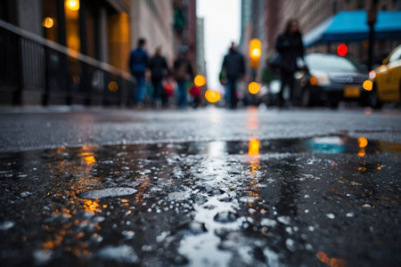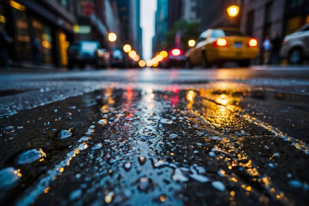 Raindrops on the street in New York City, USA. Shallow depth of field