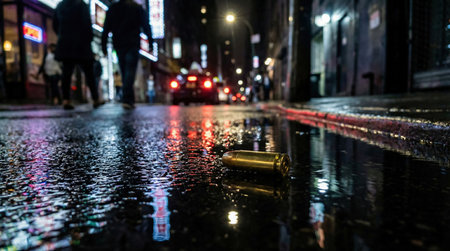 The bullet sleeve fell on the ground. Bullet casing on wet urban street at night.