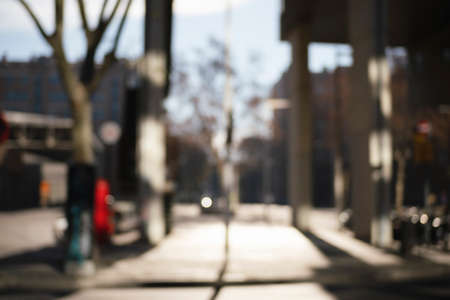 Defocused road side. Natural bokeh of old city view, blurred out of focus background. Abstract beautiful backdrop for text or advertising. Unfocused urban scene, street with houses and cars