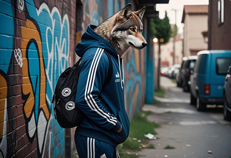 A person wearing a blue tracksuit with white stripes stands against a colorful graffiti wall. The individual has a wolf's head, creating a surreal and artistic effect. The background features urban elements like parked cars and buildings.