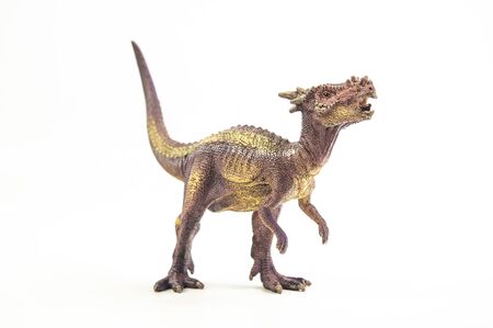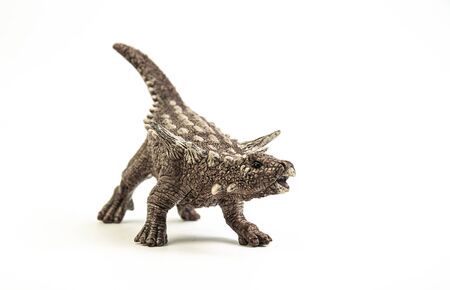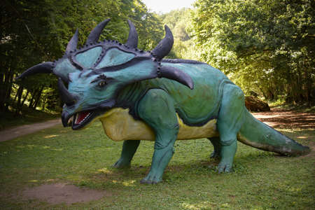 Rasnov, Romania - October 3, 2020: Details with a Styracosaurus dinosaur model at an outdoors dino park in Romania.