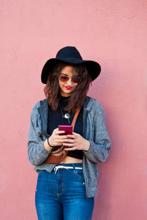 stylish hipster girls with pink hair and sunglasses using smartphone in city