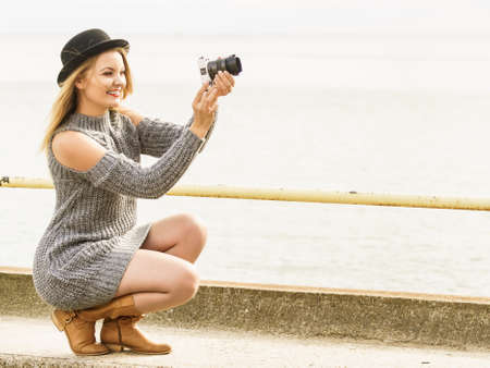 Smiling woman wearing black hat and grey sweater taking pictures using digital camera on outdoor photo session. Female having passion.