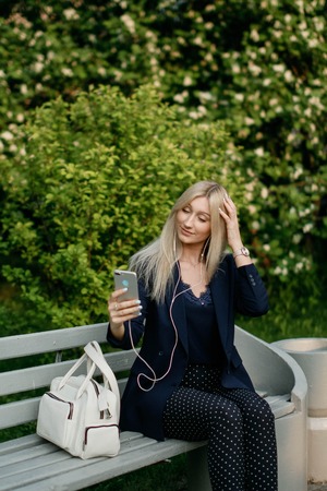 A young attractive woman takes a picture of herself on her smartphone, sitting on a street bench during the lunch break. Bearing without rest in the daytime outdoors