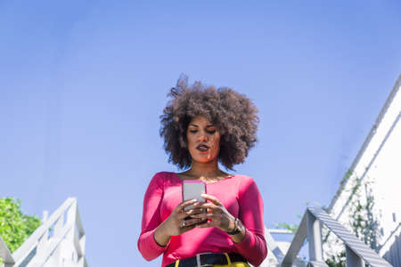 Attractive brunette girl writes a mobile message while walking down some stairs