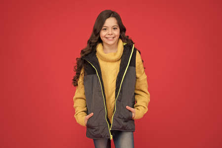 Teen style. Beautiful female model with long hair posing at studio in youth clothes. Red background. Beauty, fashion.