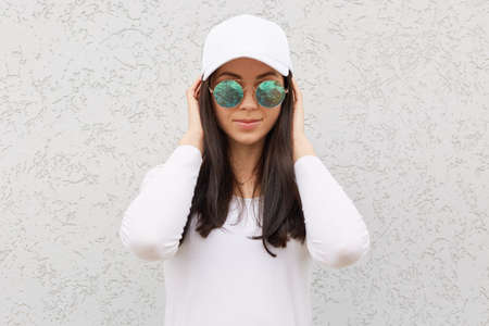 Beautiful young brunette woman with brown eyes in a stylish American baseball cap in a stylish leather white jacket in torn jeans enjoys the rest sitting on the asphalt on a summer day. Cute girl.