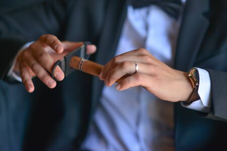 Cigar pruning. Cigar on hands close-up, dressing, man's style, stylish man. Elegant young handsome man. Men's jacket, hands cover the button. Business style.