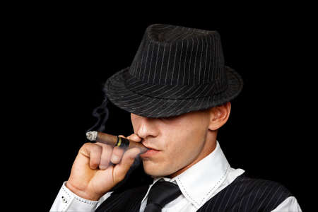 A bearded gangster among thick cigar smoke on the street. Retro. Outdoors.
