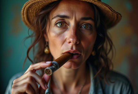 In the heart of Havana, a young Cuban woman captivates with her charm, savoring a fine cigar as she reflects on the lively spirit surrounding her, a moment steeped in tradition.