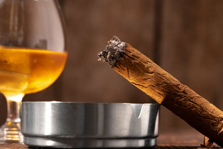 Cuban cigars and a glass of brandy on wooden background, closeup view with details