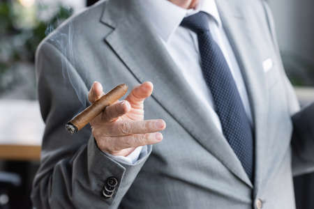 cropped shot of confident businessman in eyeglasses smoking cigar