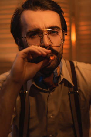man in eyeglasses smoking cigar and looking at camera near blurred folding screen
