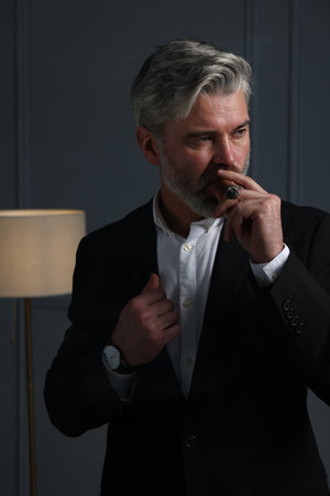 Handsome bearded man smoking cigar near dark gray wall indoors