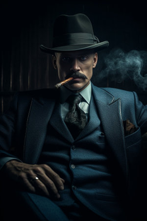 Portrait of a handsome courageous man sitting pensive in the dark and smoking a cigar. Luxurious lifestyle. Retro style. Mafia and criminal world, detective.