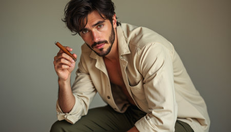 A striking man with tousled dark hair and a well-groomed beard sits casually, holding a cigar while exuding an air of confidence. His intense gaze and relaxed posture create a compelling atmosphere, inviting viewers to explore the depth of his character and the story behind the moment.