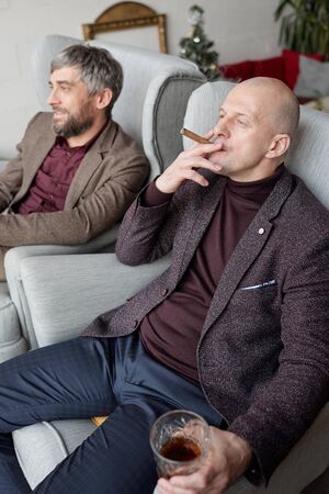 Relaxed bald businessman in fashionable outfit sitting in armchair and smoking cigar with friend