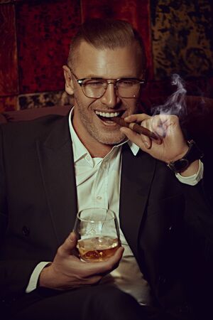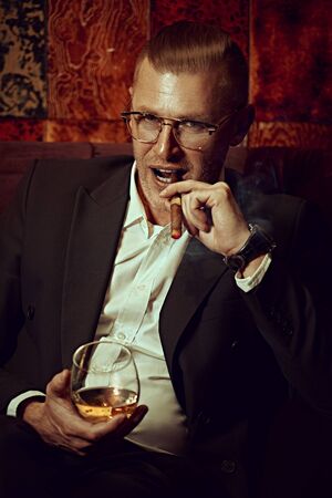 Portrait of a handsome middle-aged man in an expensive suit and glasses drinking whiskey and smoking a cigar in a luxurious apartment. Success and rich lifestyle.