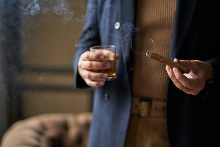 Close up shot of hand of mature man holding cigar and glass of whisky, standing indoors
