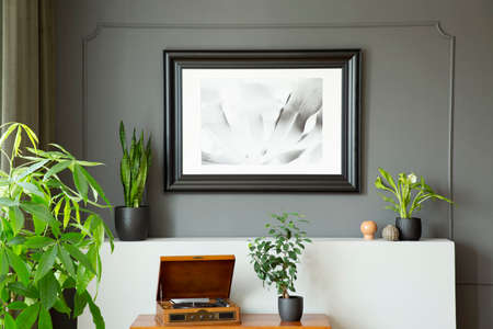 Poster on grey wall above record player and plants in retro living room interior. Real photo