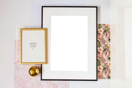 White picture frame with decorations. Mock up for your photo or text. Place your work, print art, white background, pastel color book. Photo realistic 3d illustration