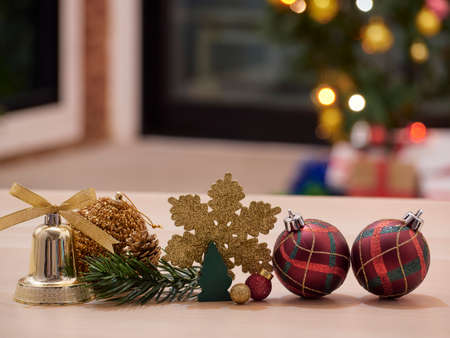 Christmas decorations on wooden table with blurred decorated christmas tree and bokeh lights in background.