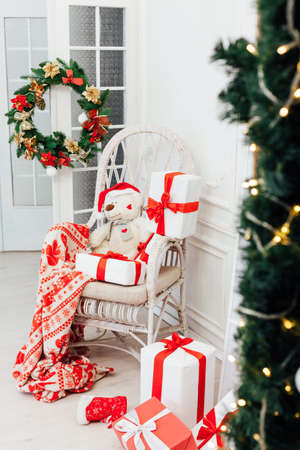 lots of Christmas gifts for the new year decor white interior as a background