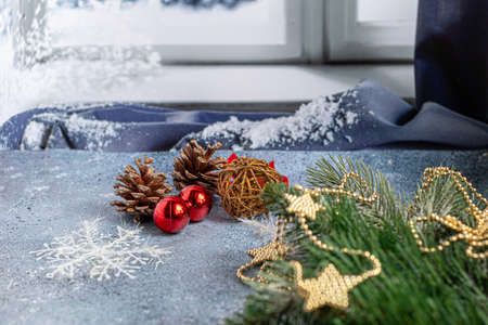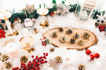 Festive Christmas background with santa claus, pine cones, red berries and candlesticks. Red and gold Christmas decorations on the windowsill.