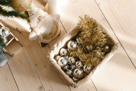 Basket with Christmas balls and toys under the Christmas tree. Preparing to decorate the Christmas tree. Silver and golden balls, tinsel with box on a wooden floor.