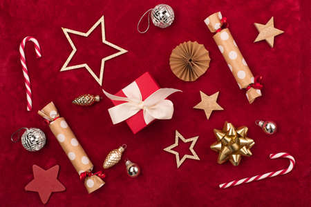 Christmas holiday winter New Year festive card. Xmas gold wooden decorations, gift boxes, candy canes on red background. Flat lay, top view, copy space.