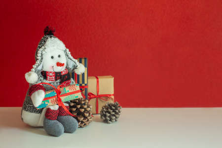 Christmas gifts, decorative snowman and pine cones are on a red background. Free space for text.