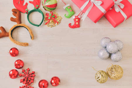 Merry Christmas and Happy new year background concept. Various christmas decoration items on wood background