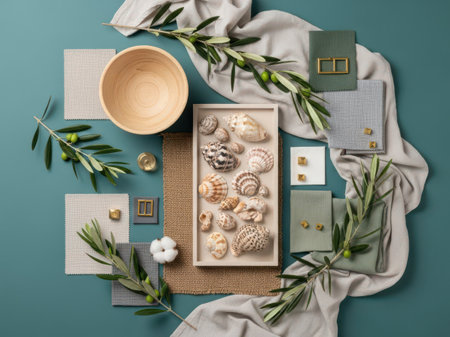 A carefully arranged flat lay featuring seashells, olive branches, and various decorative items against a teal background.