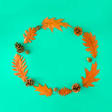 Creative copy space. Autumn seasonal schedule with autumn fruits and leaves. Nature is flat. On a pastel green background.