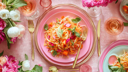 A stunning presentation of a fresh and colorful salad adorned with edible flowers on a beautifully set pink table, perfect for spring gatherings.