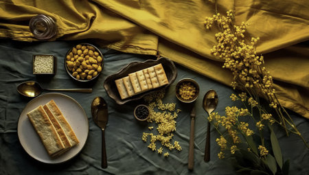 Topview image of bulgur, pastry, whitу cheese, olives, grilled brokkoli and onions in ceramic plates with blue and white pattern placed on a yellow woven blanket