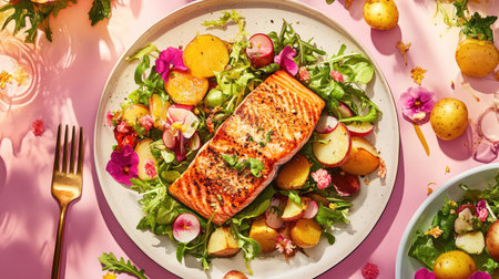A stunning plate of grilled salmon served on a vibrant salad of arugula, colorful vegetables, and garnished with edible flowers, set against a playful pink background.