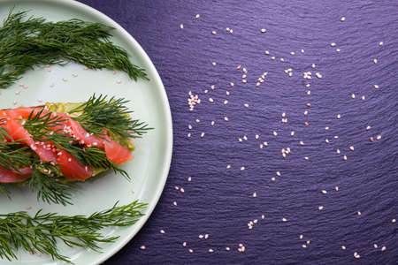 appetizing slices of crispy baguette with avocado and smoked salmon fillet and fresh dill sprigs on a green plate, black background and left side
